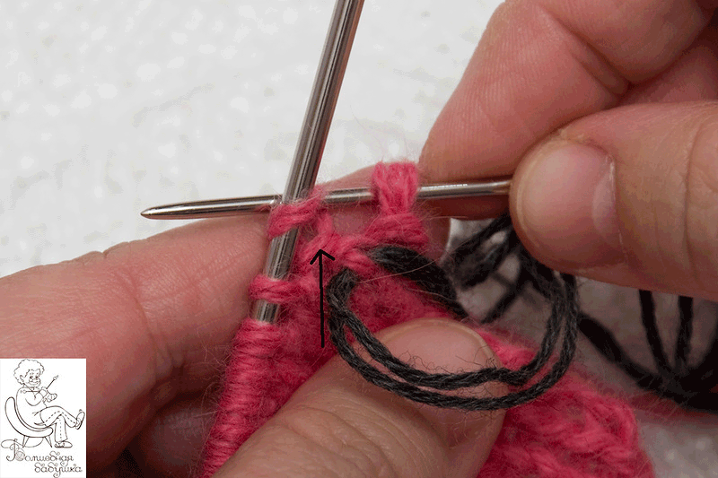 6) Ищем левую дужку петли от пары «изнанка с изнанкой». Она показана стрелочкой. Петля сейчас хорошо видна, т.к. я ее подтянула. На самом деле она чуточку бывает утоплена в предыдущем ряду.