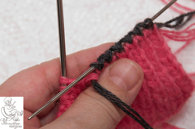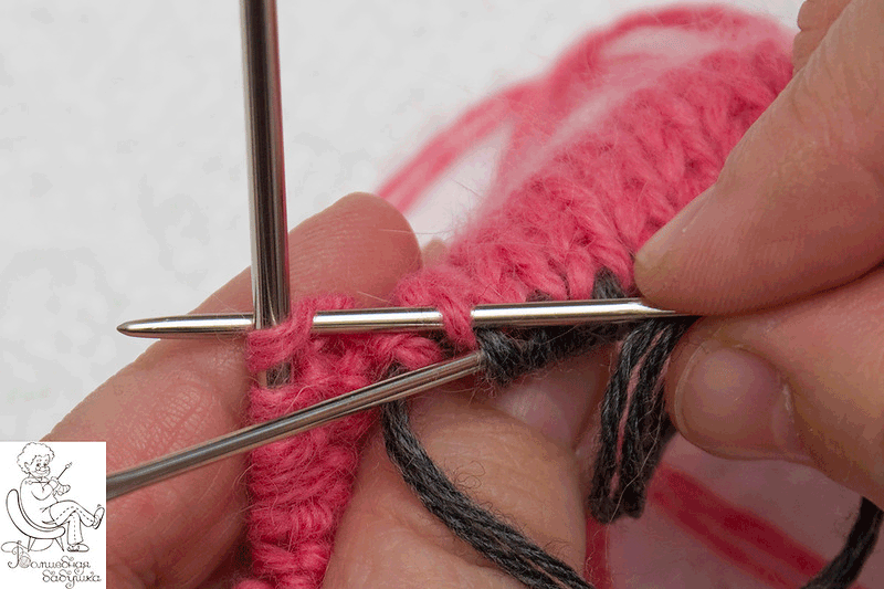 Игла выходит из 2-й лицевой петли и входит в 1-ю лицевую (с лица на изнанку).