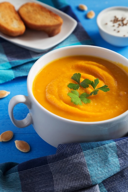 Суп-пюре с картофелем получается более насыщенным и питательным. Готовить его можно как осенью, так и зимой. Для приготовления блюда в зимний период тыкву зачастую чистят, нарезают кубиками и замораживают.