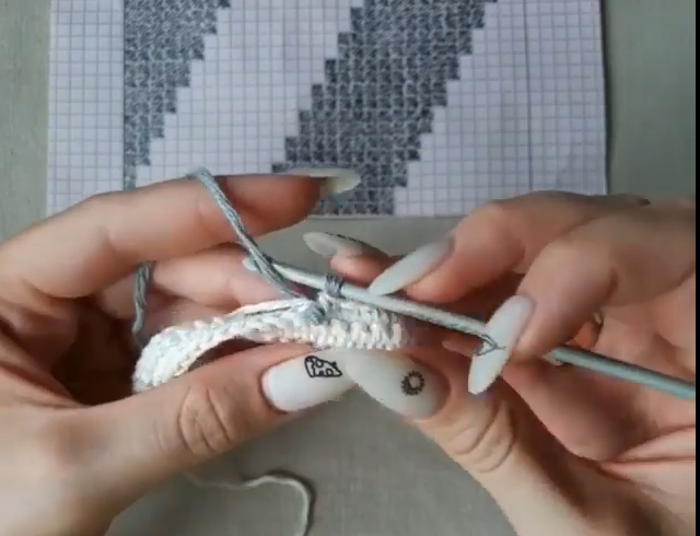 - Провяжите фоновой нитью до начала рисунка, присоедините цветную нить, ее можно не привязывать, оставив свободный кончик, который в конце вязки закрепите, а затем заправьте в полотно.